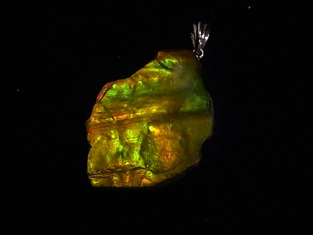 アンモライトには偽物があります。色のついたガラスを張り合わせたものもあるので注意してください。